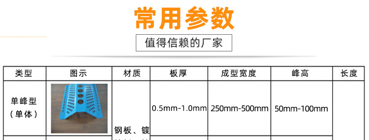 成型寬度在250mm--500mm之間,峰高50mm--100mm,長度在6米之內(nèi)都可以加工。板材厚度0.5mm--1.5mm,在以上范圍之內(nèi),可以根據(jù)客戶的要求進行加工制作。